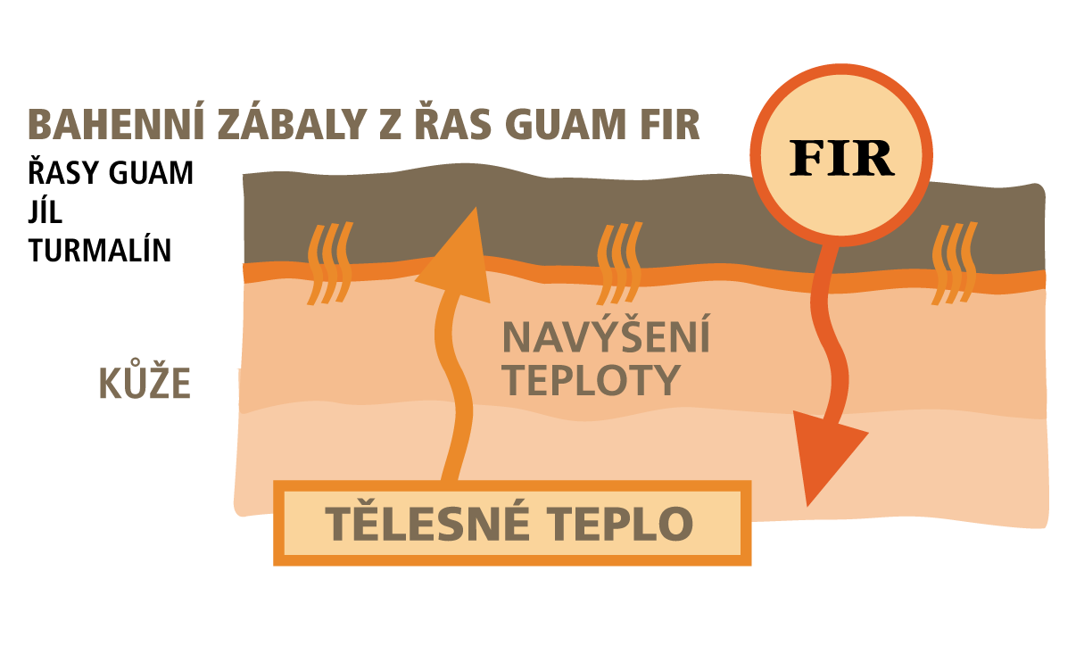 Je to prosté. Bahenní produkty GUAM obsahují kromě blahodárných mořských řas také minerální látky. Při aplikaci těchto výrobků na pokožku dochází k více či méně intenzivnímu zvýšení teploty. Odkud se to teplo bere? Přece z nás! Lidský organismus je jako neustále zažehnutá pec. Teplo v něm vytvářené pak přirozeně uniká přes kůži ven. Složení produktů GUAM však naše vlastní teplo zachycuje. Při aplikaci bahenních zábalů se na kůži vytváří další vrstva, ve které je tělesné teplo zachyceno a minerály obsažené v přípravcích pak toto tělo přeměňují na FIR neboli vzdálené infračervené paprsky.