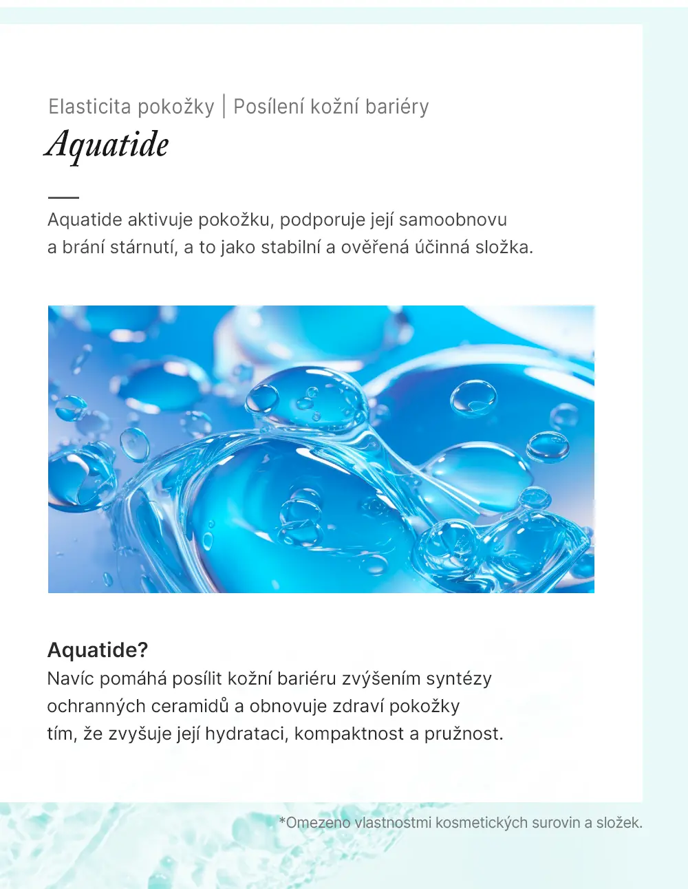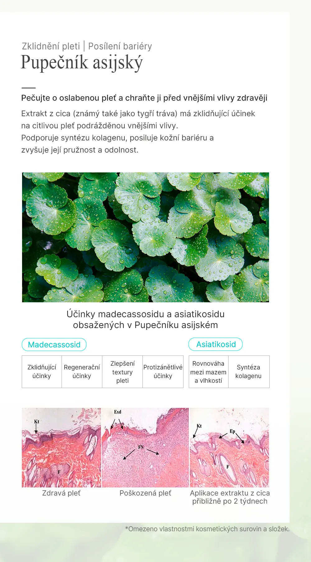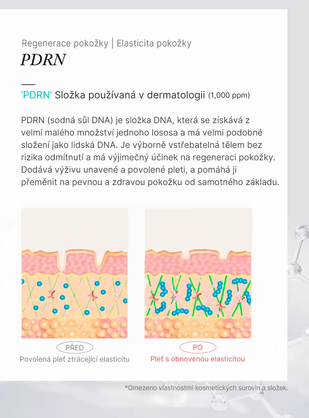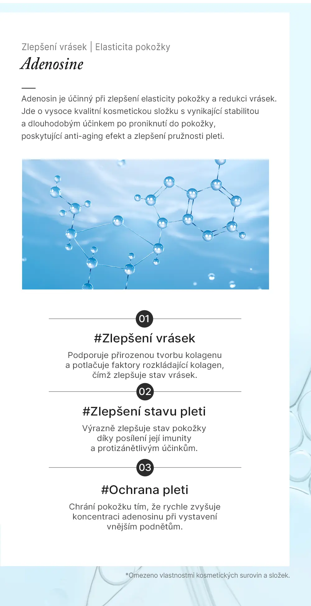 Purified water, butylene glycol, glycerin, glycereth-26, niacinamide, 1,2-hexanediol, PEG/PPG-17/6 copolymer, bis-PEG-18 methyl ether dimethyl silane, betaine, PEG-60 hydrogenated castor oil, arginine, carbomer, sodium diene, allantoin, panthenol, ethylhexyl glycerin, xanthan gum, adenosine, glyceryl acrylate/acrylic acid copolymer, disodium EDTA, dipotassium glycyrrhizate, PVM/MA copolymer, madecassoside, Houttuynia cordata extract, tocopherol, sodium hyaluronate, asiaticoside, centella asiatica extract, tocopherolUpozornění k použití