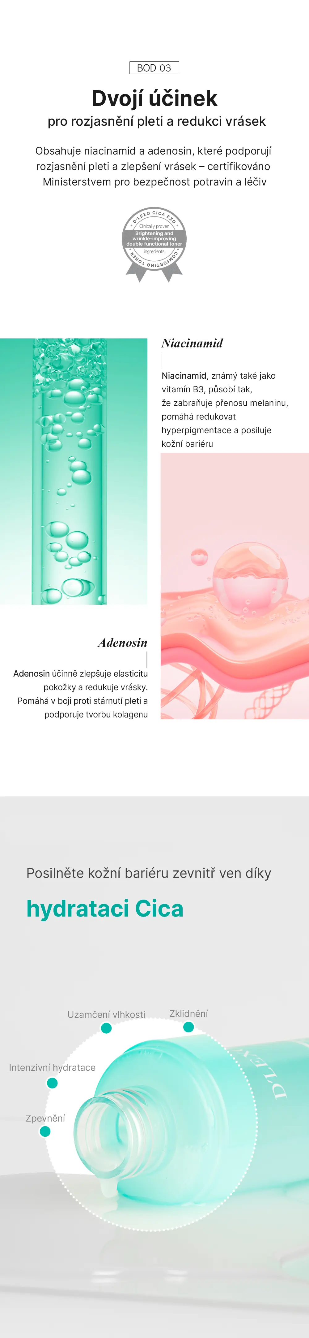 Diglycerin, Sodium DNA (10,000 ppm), Methyl Gluceth-20, Centella Asiatica Extract, Panthenol, Xylitylglucoside, Polyglyceryl-10 Laurate, Betaine, Anhydroxylytol, Tara Fruit Extract, Hydroxyacetophenone, Polyacrylate Crosspolymer-6, Caprylic/Capric Triglyceride, Xylitol, Polyglyceryl-3, Cotton Extract, Sodium Hyaluronate, Hydrogenated Lecithin, Acorus Calamus Root Extract, Adipic Acid, Perilla Leaf Extract, Adenosine, Glucose, Polyquaternium-51, Scutellaria Baicalensis Root Extract, Polygonum Multiflorum Root Extract, Common Jasmine Oil, Glyceryl Acrylate/Acrylic Acid Copolymer, Phytosteryl/Octyldodecyl Lauroyl Glutamate, Spanish Licorice Root Extract, Green Tea Extract, 3-O-Ethyl Ascorbic Acid, Asiaticoside, Ceramide NP, Bladderwrack Extract, Matricaria Flower Extract, Rosemary Leaf Extract, Prunella Vulgaris Extract, Hydrolyzed Hyaluronic Acid, Dextrin, Ethylhexylglycerin, Sodium Acetylated HyaluronateUpozornění k použití